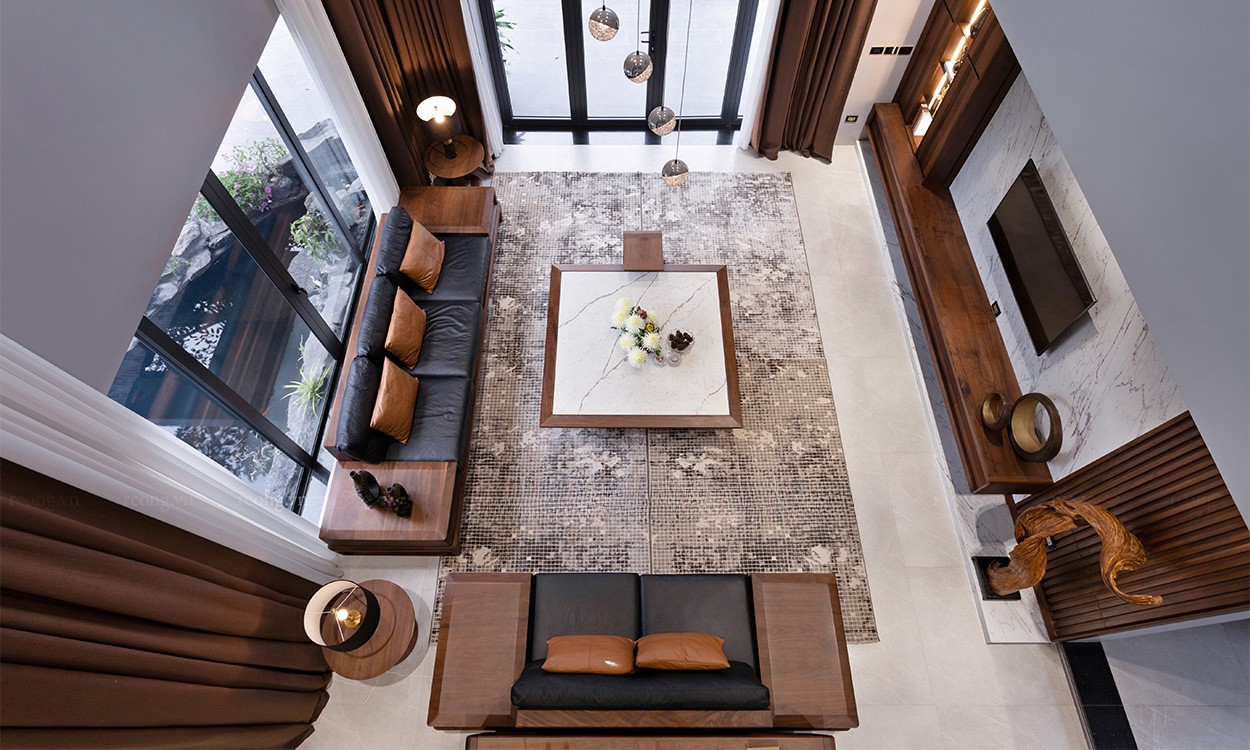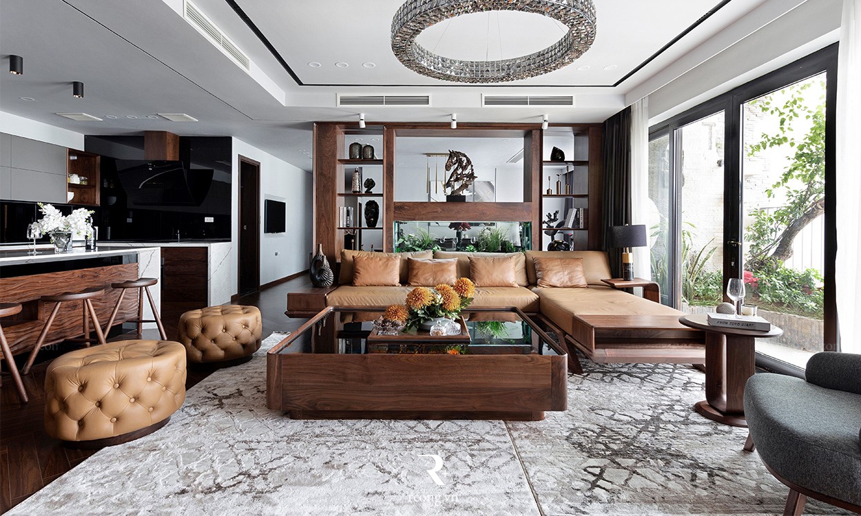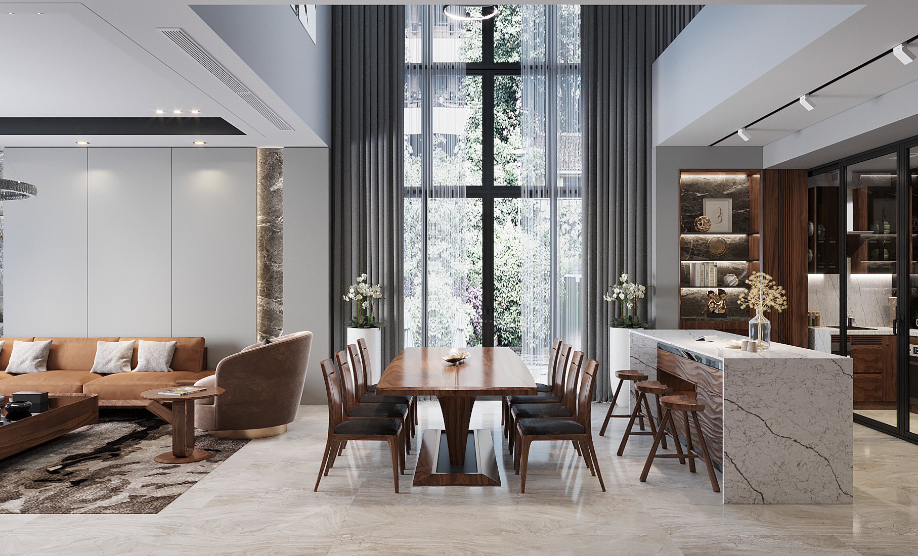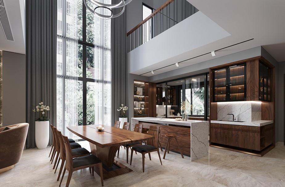Ánh sáng tự nhiên, len lỏi qua những ô cửa kính lớn, làm nổi bật vẻ đẹp của gỗ óc chó, khiến cho không gian thêm phần ấm áp và gần gũi. Những chi tiết trang trí như đèn chùm, tranh ảnh, cây xanh... được lựa chọn tỉ mỉ, hài hòa với tổng thể, tạo nên một không gian sống hoàn hảo, nơi ta có thể tìm thấy sự bình yên và hạnh phúc.