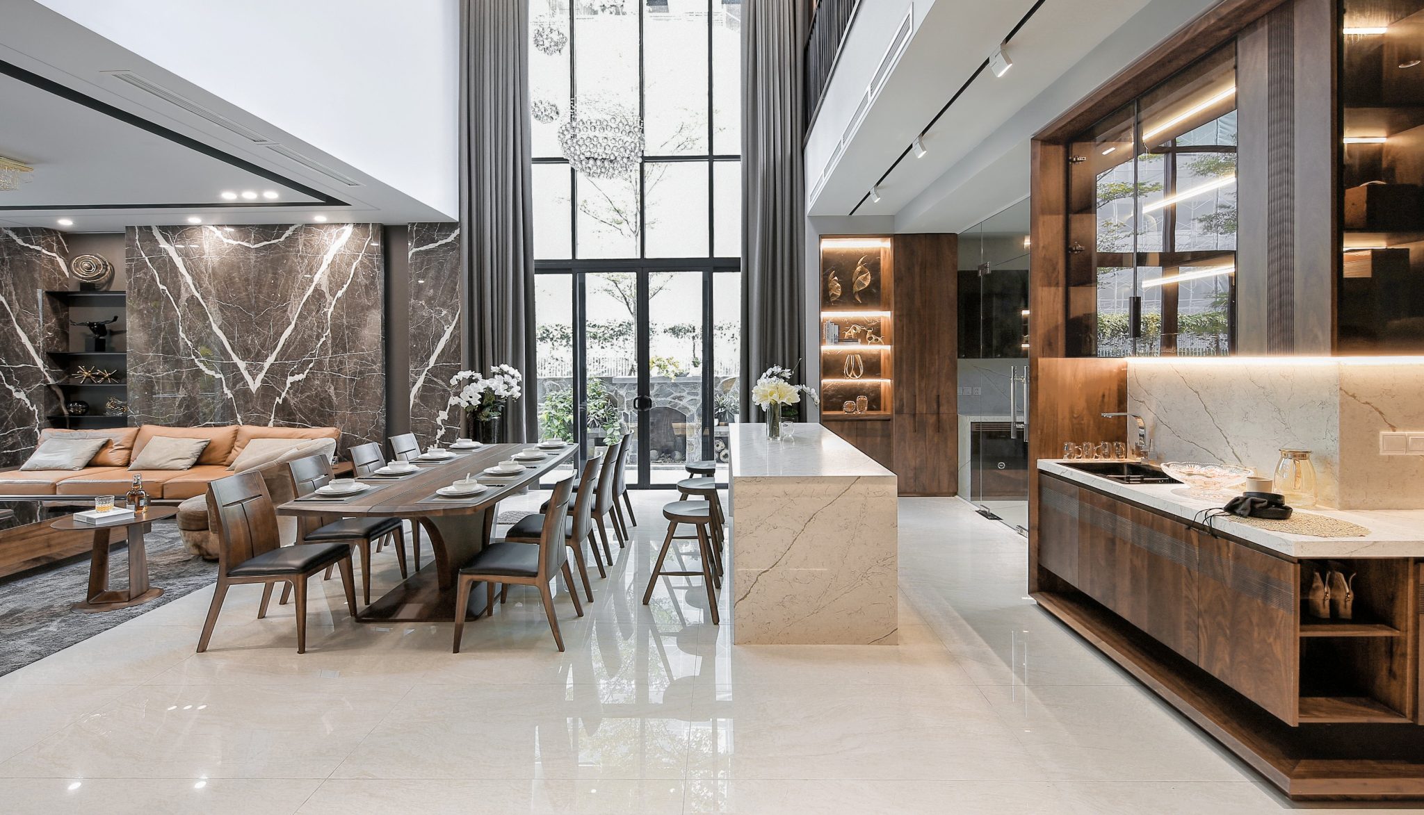 Bước vào không gian biệt thự tại Ecopark, ta như lạc vào bản giao hưởng của gỗ óc chó - một chất liệu không chỉ đơn thuần là vật liệu, mà còn là linh hồn, là tuyên ngôn về đẳng cấp và gu thẩm mỹ tinh tế. Nơi đây, phòng khách và phòng bếp hòa quyện vào nhau, tạo nên một không gian sống liền mạch, sang trọng và ấm cúng, nơi mỗi chi tiết đều toát lên vẻ đẹp tự nhiên, mộc mạc mà vô cùng quyến rũ của loại gỗ quý này.