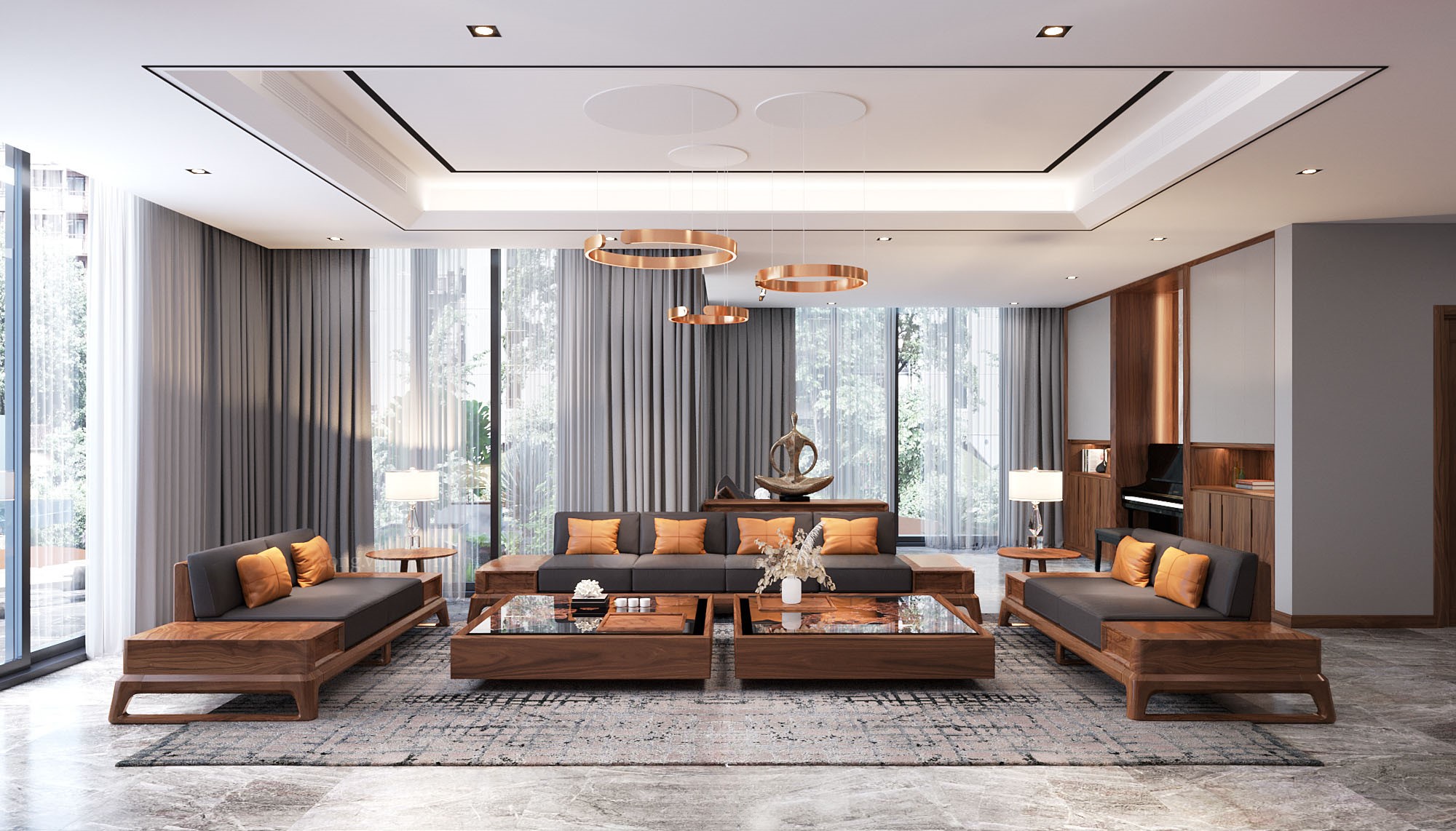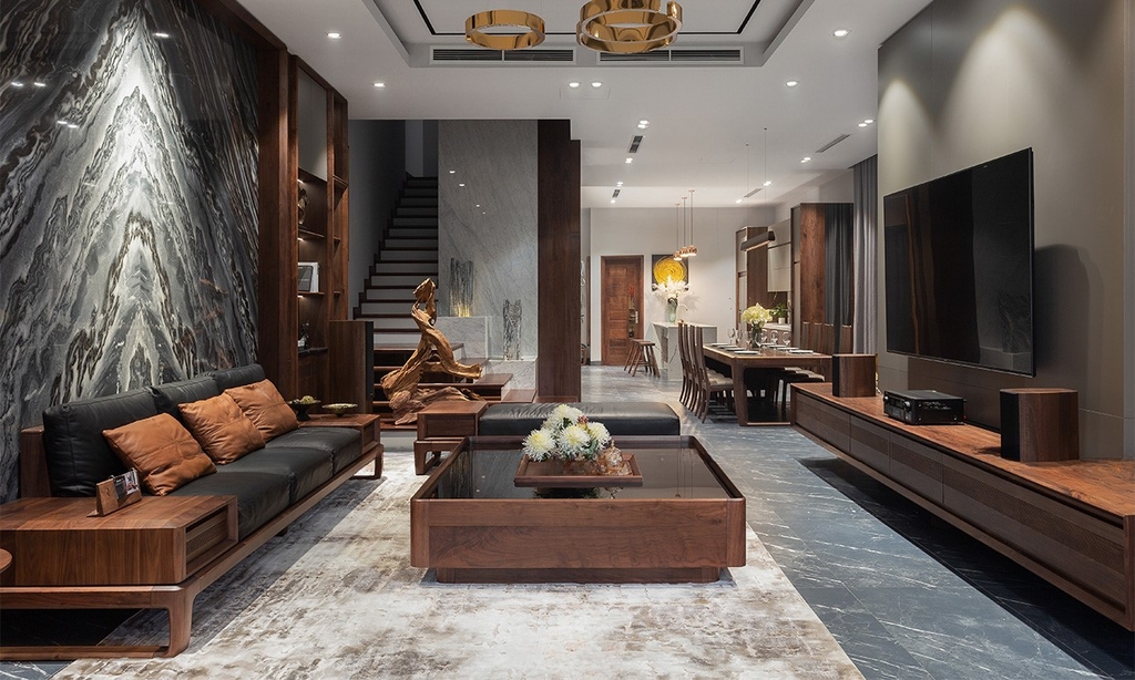 Gỗ óc chó, với những đường vân uyển chuyển như dòng chảy của thời gian, được các nghệ nhân tài ba chế tác thành những món đồ nội thất đầy mê hoặc. Tại phòng khách, bộ sofa gỗ óc chó vững chãi, với những đường nét vuông vắn mà mềm mại, ôm trọn lấy những chiếc đệm da màu trung tính, mời gọi ta thả mình vào sự êm ái và thư giãn. Bàn trà, với mặt kính đen huyền bí hoặc đá tự nhiên sang trọng, trở thành điểm nhấn trung tâm, nơi những đóa hoa tươi thắm khoe sắc, mang đến sự tươi mới và sinh động cho không gian. Kệ tivi và tủ trang trí gỗ óc chó, được bố trí khéo léo, không chỉ là nơi lưu trữ đồ đạc mà còn là những tác phẩm nghệ thuật, thể hiện gu thẩm mỹ tinh tế của gia chủ.
