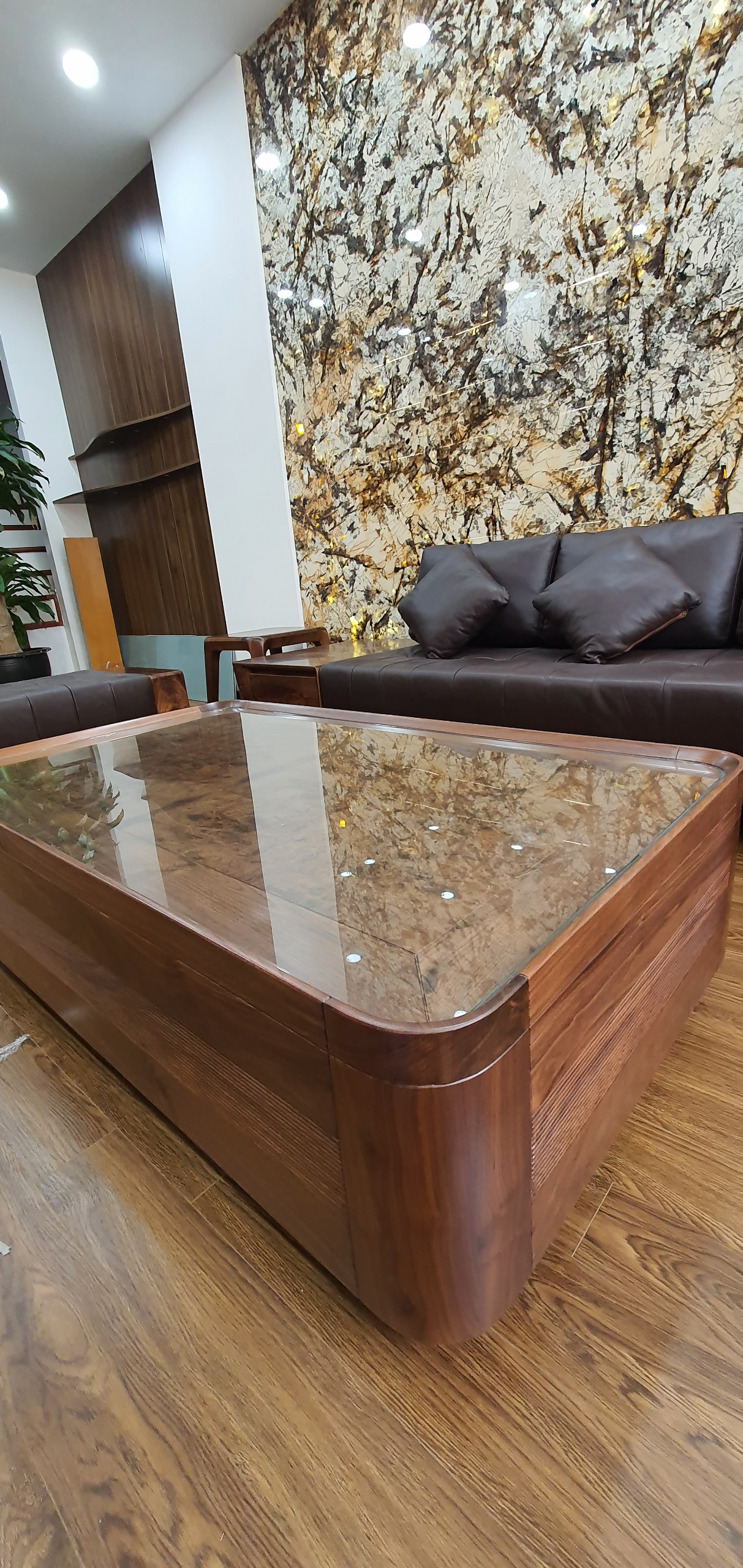 - Bàn trà mặt kính chân gỗ óc chó, kết hợp cùng thảm lông sang trọng, hoàn thiện không gian tiếp khách.