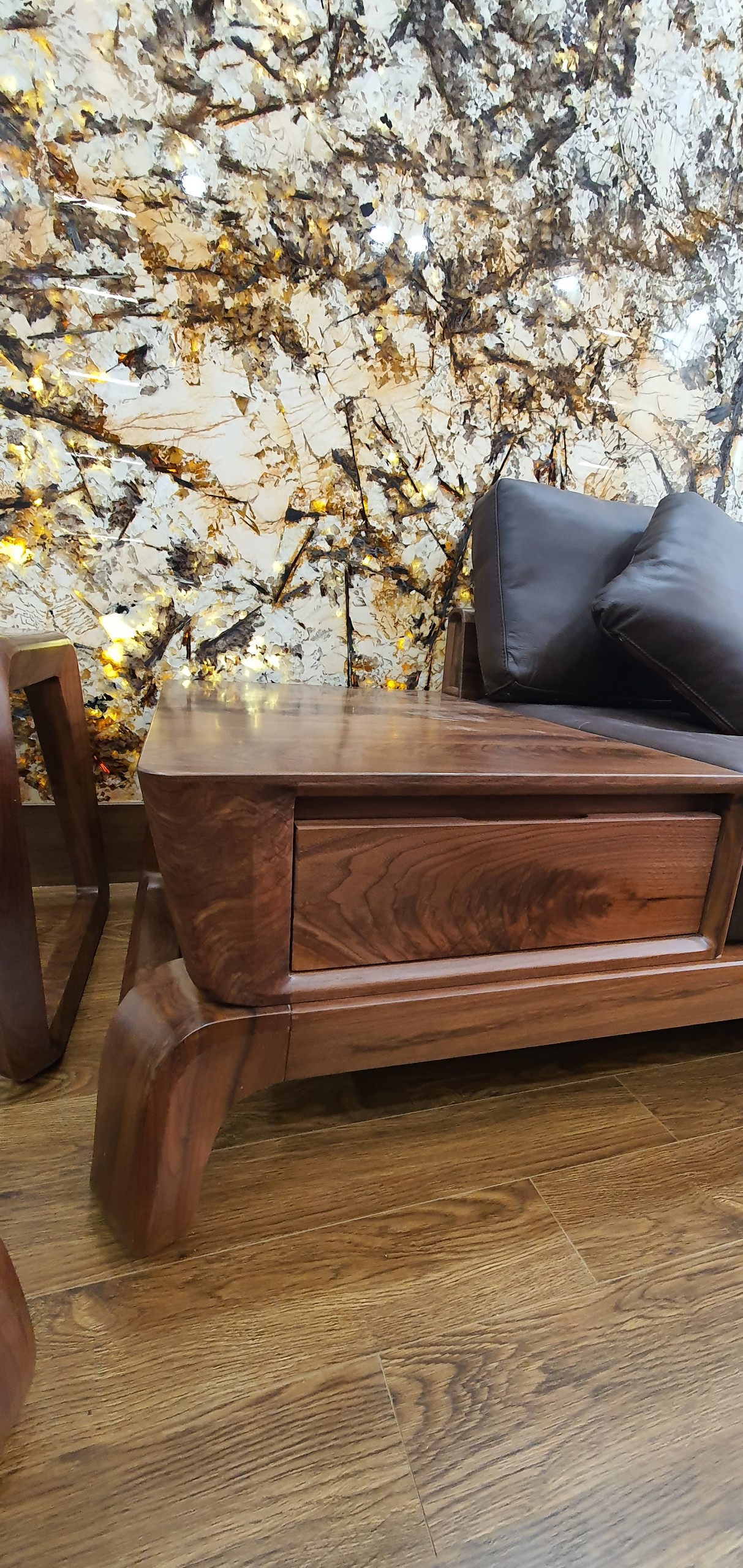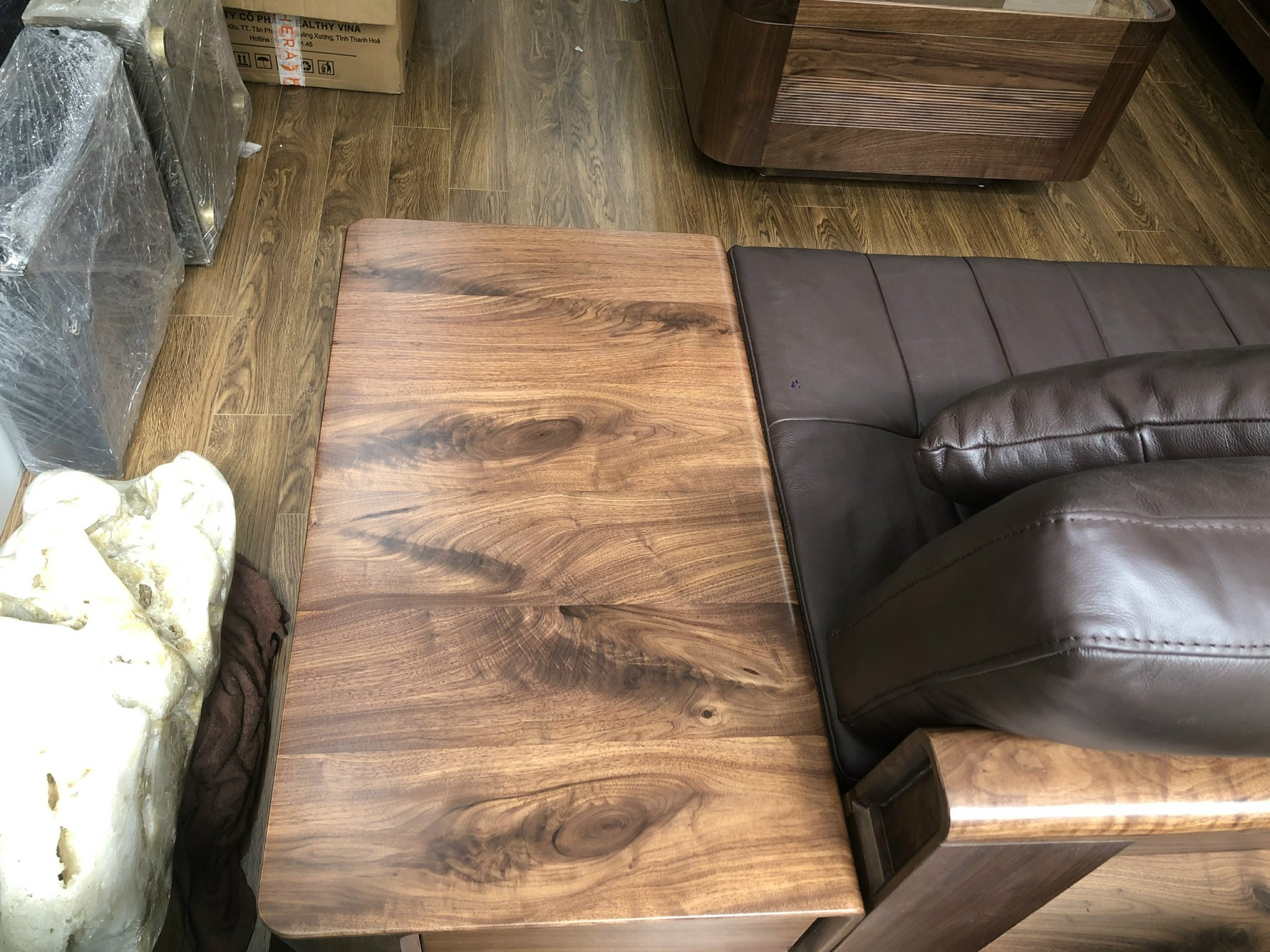 - Bộ sofa gỗ óc chó thiết kế tối giản, kết hợp đệm da cao cấp, tạo điểm nhấn ấn tượng ngay khi bước vào.