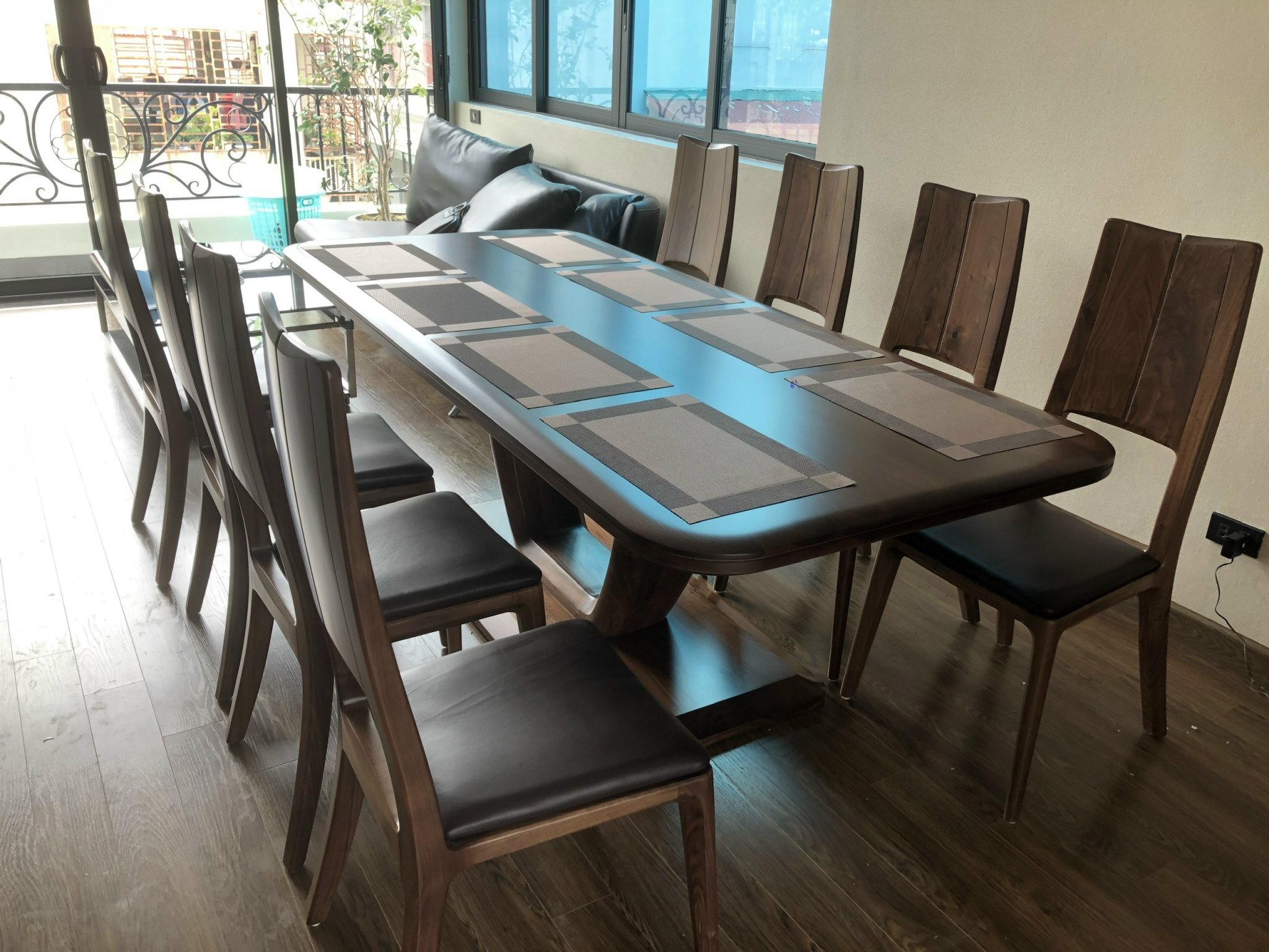 - Bộ bàn ghế ăn gỗ óc chó mặt nguyên tấm, kết hợp ghế bọc da/nỉ cao cấp, phù hợp cho những bữa cơm gia đình ấm cúng.