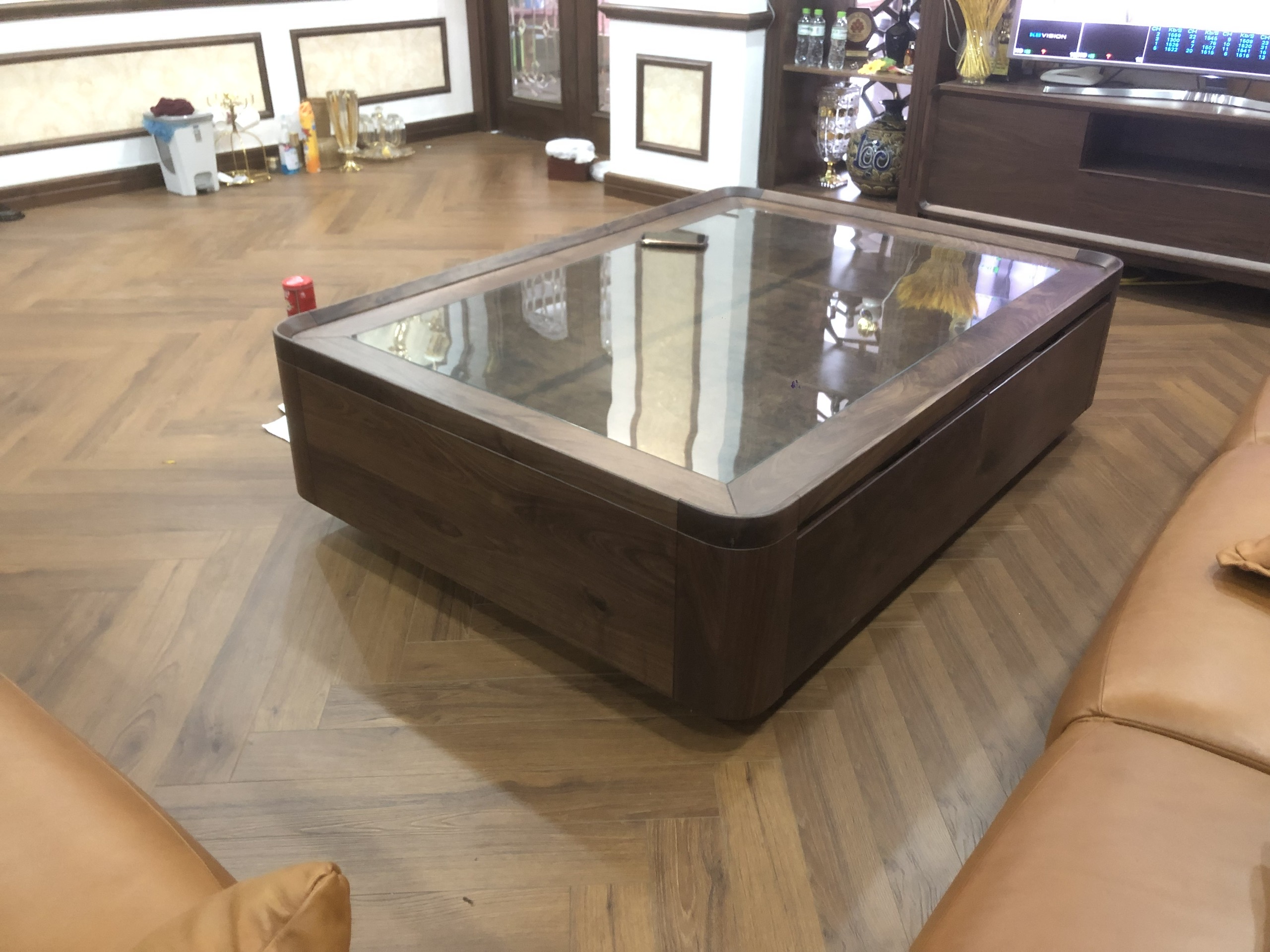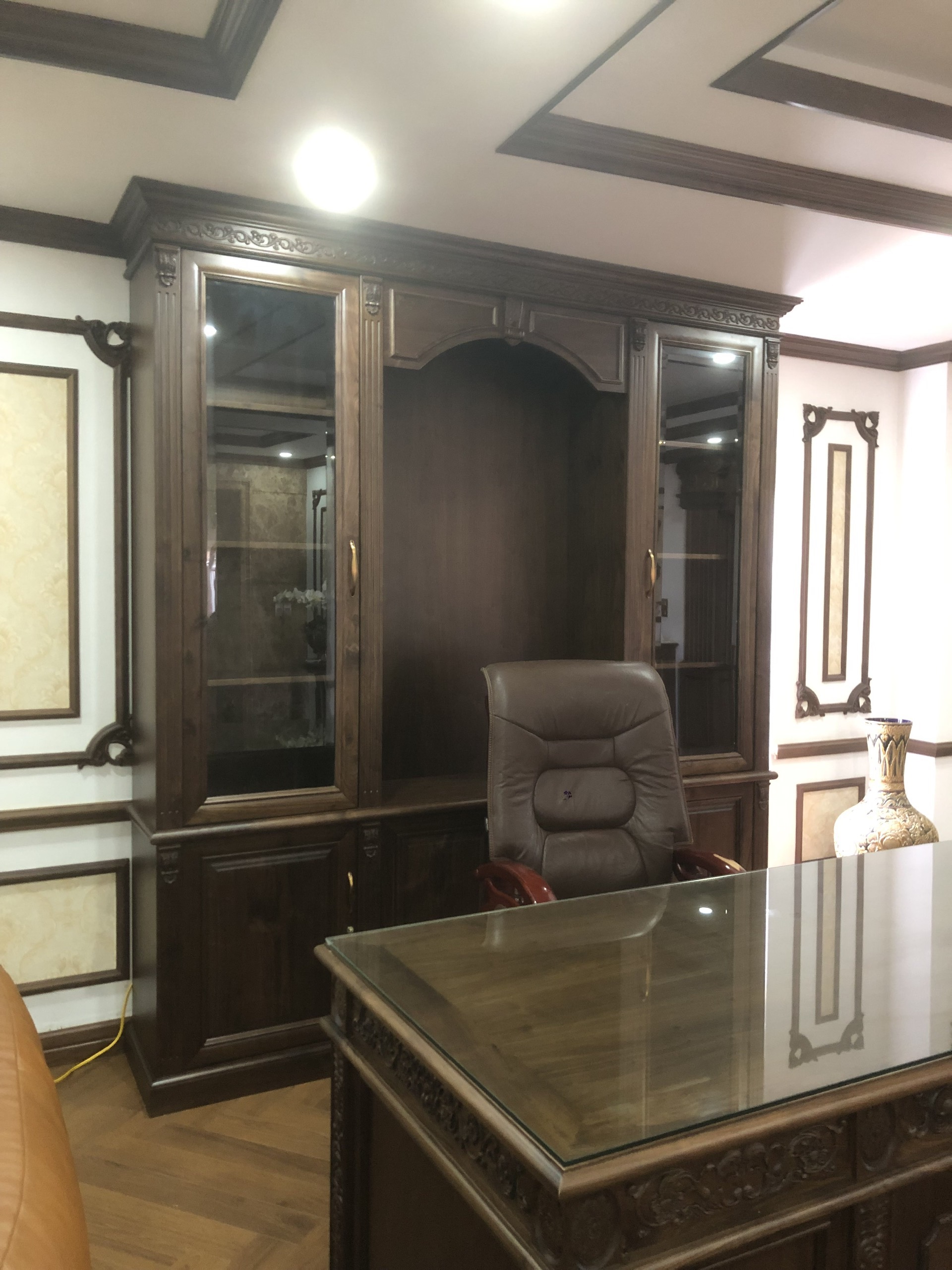 Bàn làm việc thiết kế hình chữ nhật với chân gỗ tiện tròn, kết hợp ngăn kéo phủ da cao cấp, tạo không gian làm việc sang trọng. Bàn trà mặt kính chân gỗ óc chó đặt giữa phòng khách, điểm xuyết bộ ấm trà sứ cao cấp, là nơi lý tưởng để thư giãn.