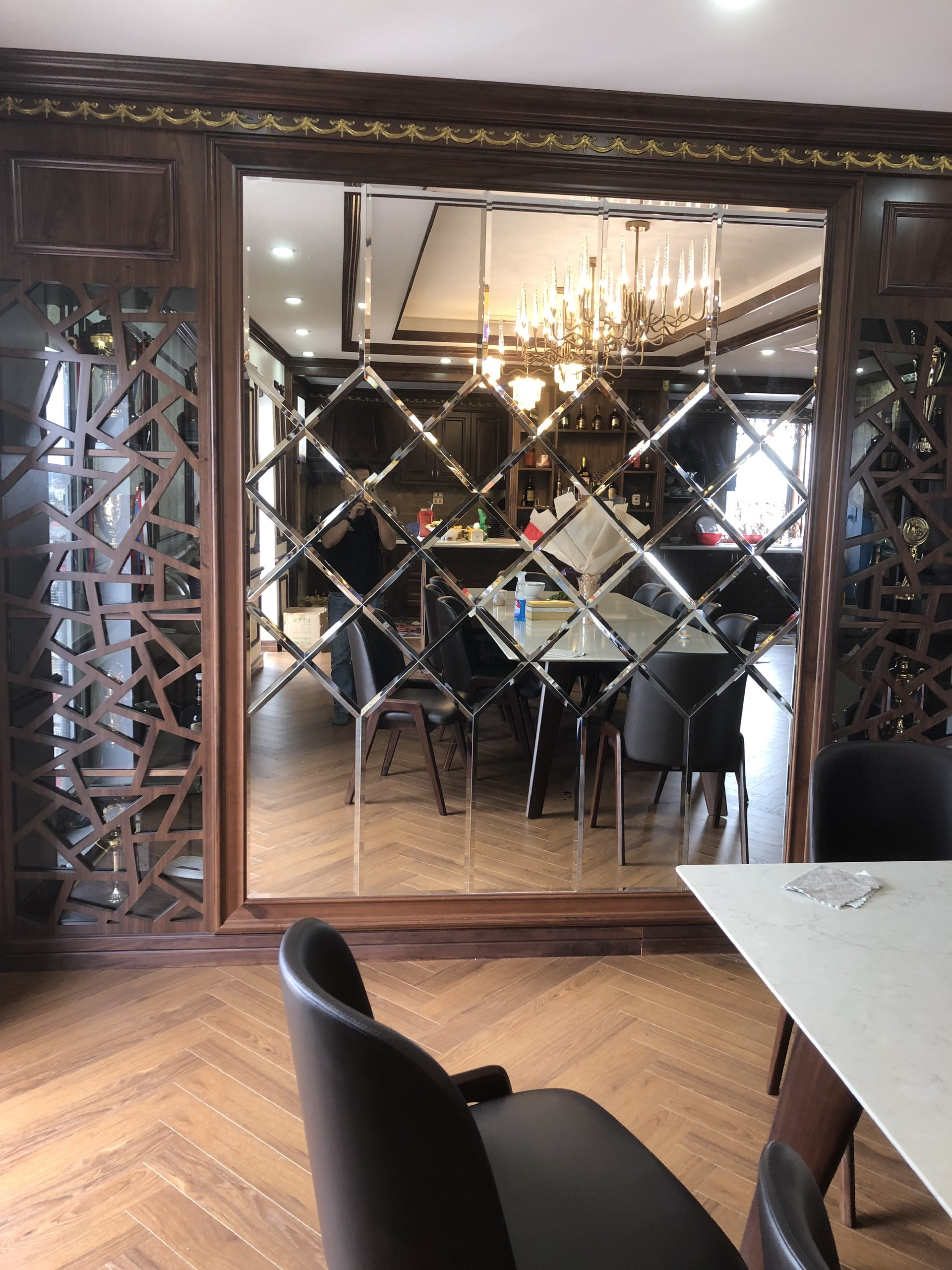 Tủ rượu làm từ gỗ óc chó nguyên khối với cánh kính cường lực phối viền đồng, trưng bày những chai rượu vang hảo hạng. Hệ thống đèn chiếu điểm nhấn tạo hiệu ứng ánh sáng lung linh, nâng tầm trải nghiệm thưởng thức.