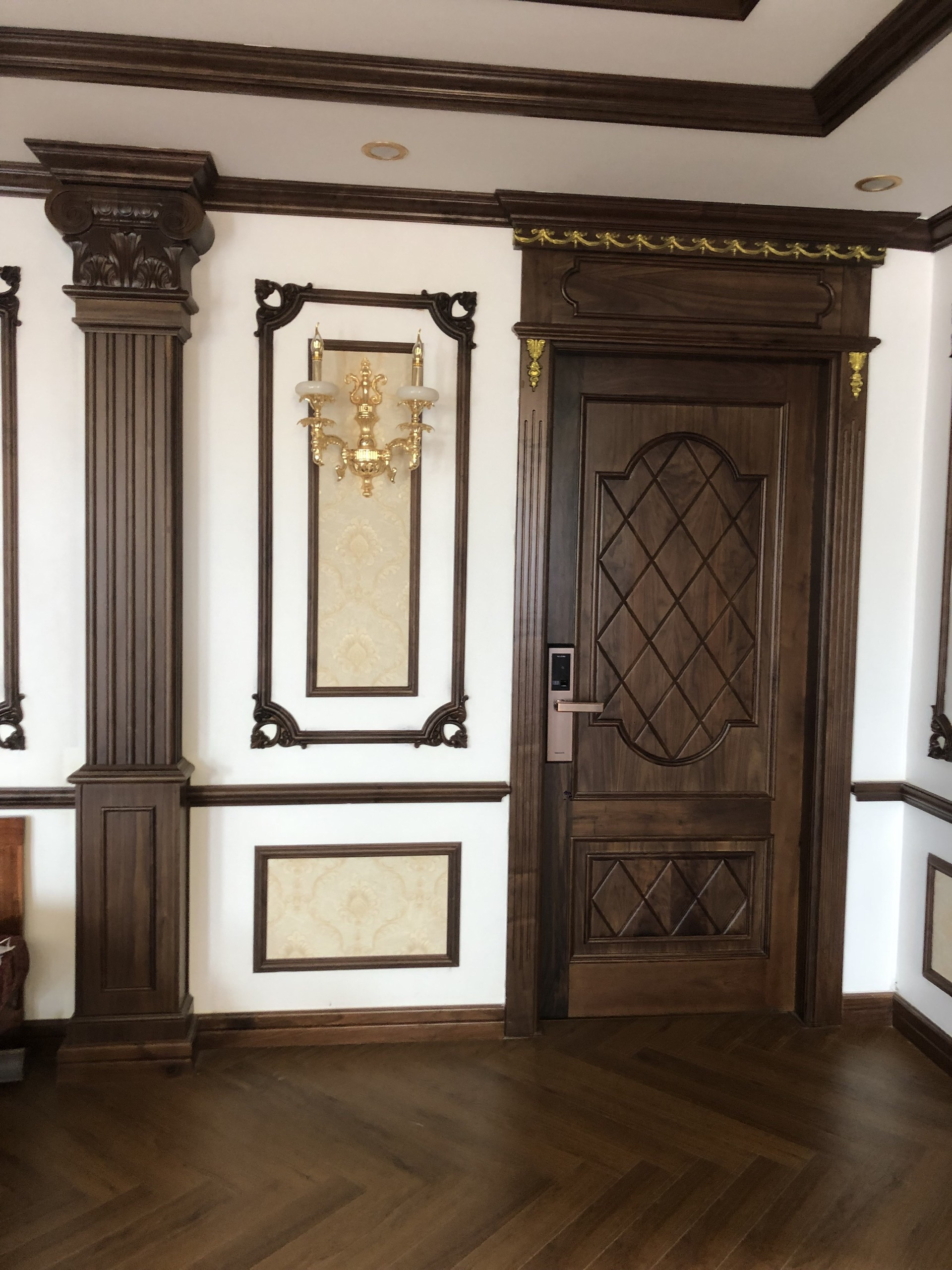 Các cánh cửa phòng được chế tác từ gỗ óc chó nguyên tấm, kết hợp họa tiết hoa văn uốn lượn tinh tế theo phong cách Pháp. Những đường chạm khắc tỉ mỉ trên khung cửa tạo điểm nhấn nghệ thuật, vừa cổ điển vừa hiện đại, khẳng định đẳng cấp của không gian.