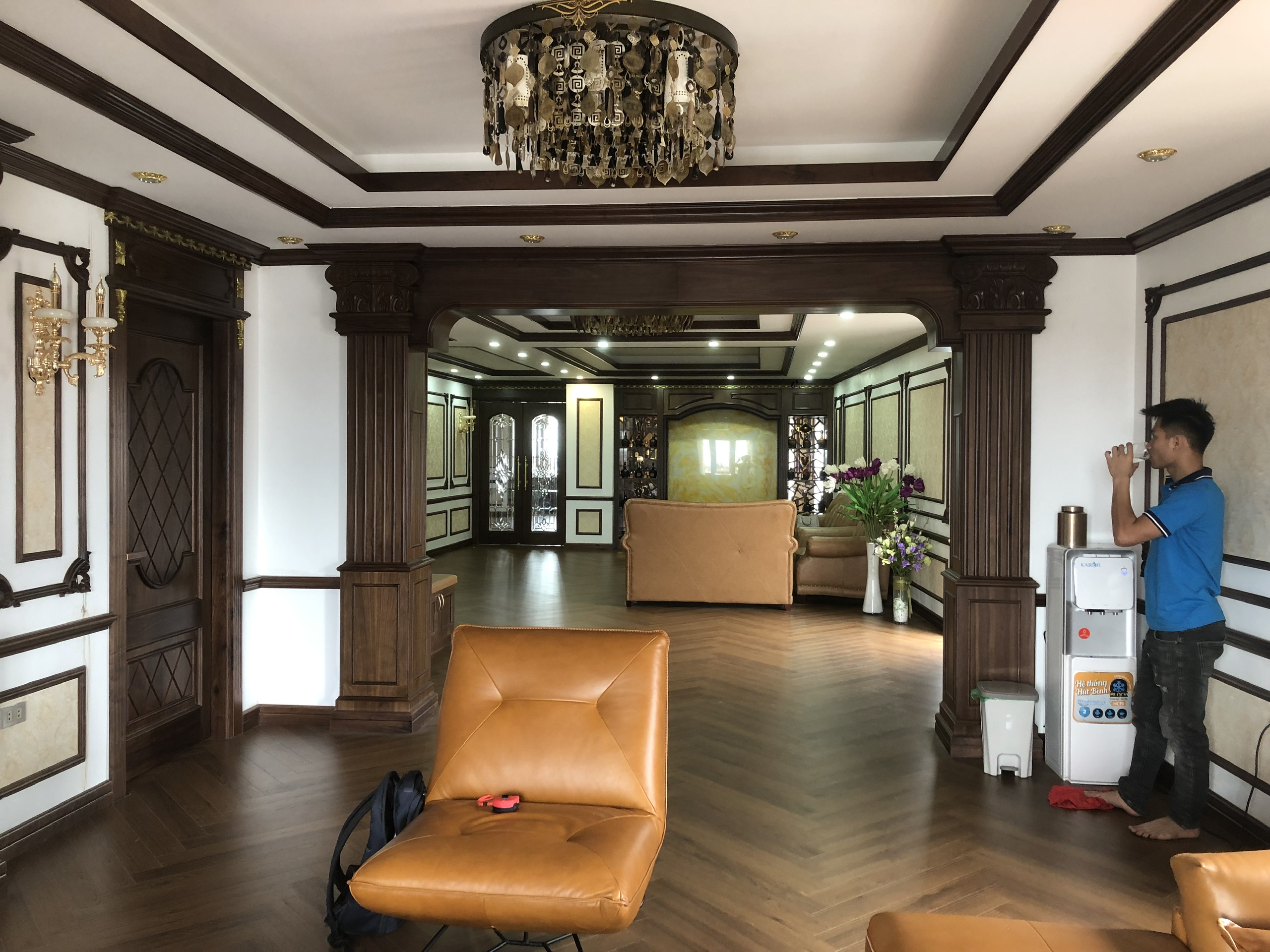 Không gian khách sạn Nasa là sự kết hợp hoàn hảo giữa phong cách tân cổ điển và chất liệu gỗ óc chó cao cấp. Sắc nâu trầm của gỗ hòa quyện cùng ánh đèn vàng ấm áp, tạo nên một tổng thể sang trọng, đầy quyến rũ.