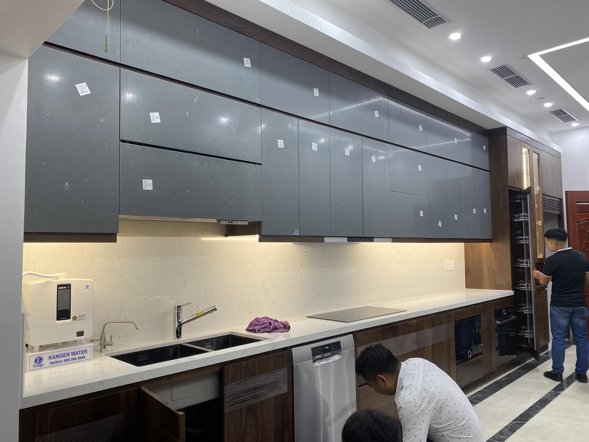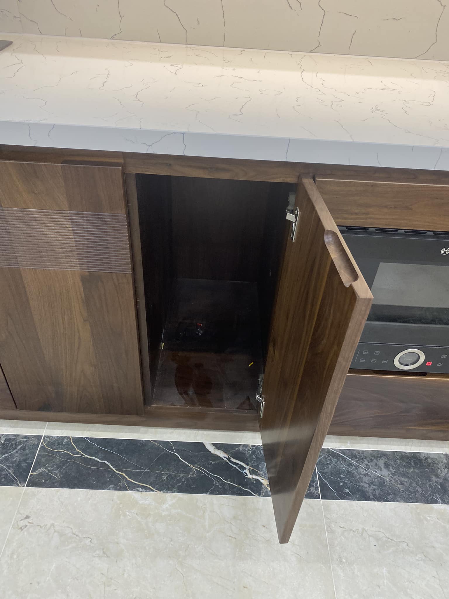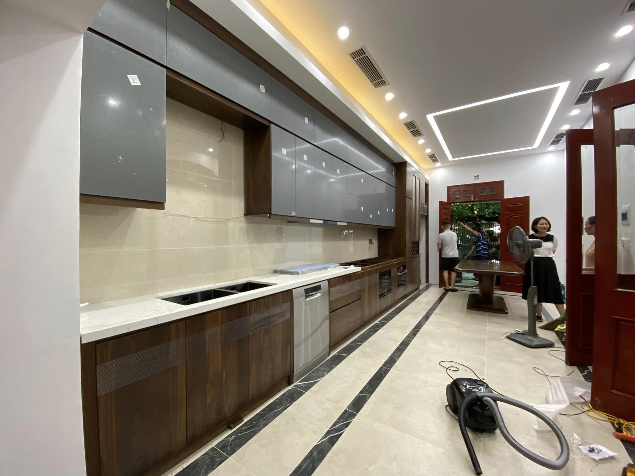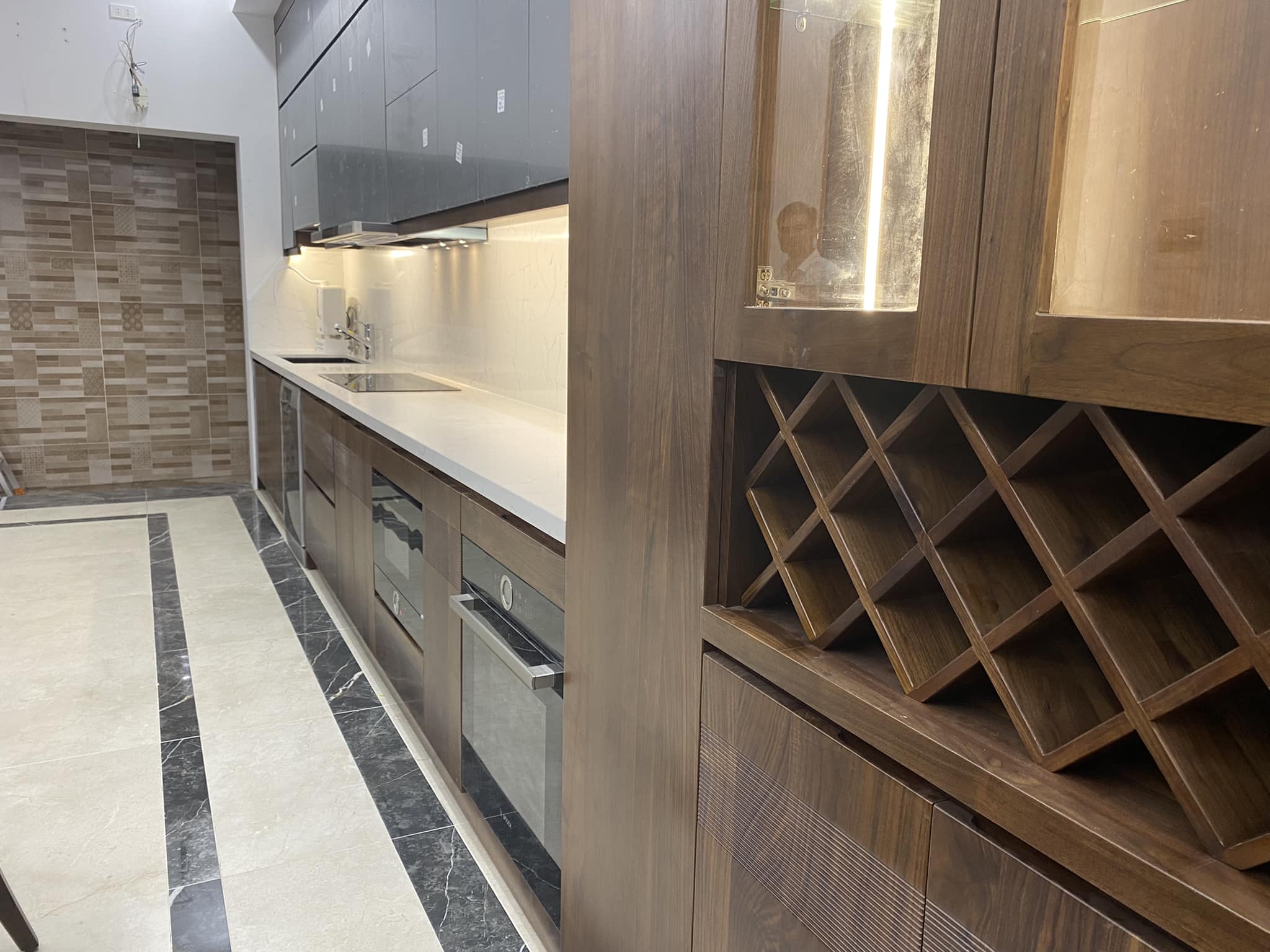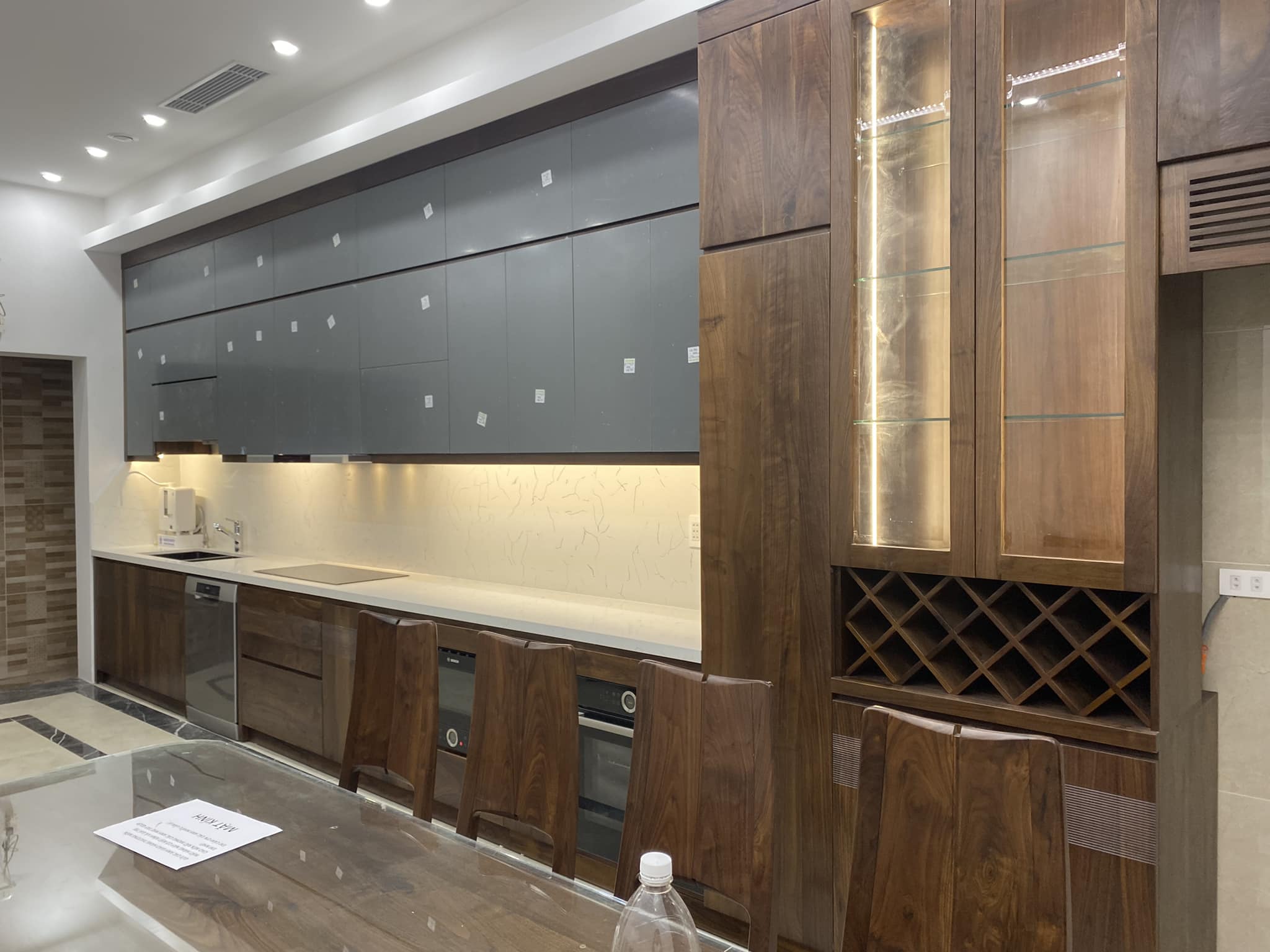 Tủ Bếp Gỗ Óc Chó Kết Hợp Cánh Acrylic – Hiện Đại & Tiện Nghi