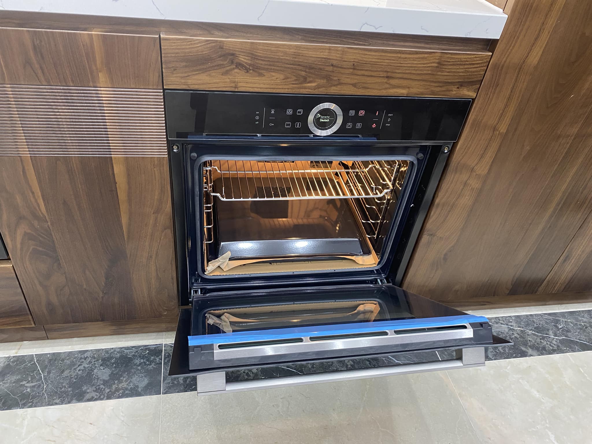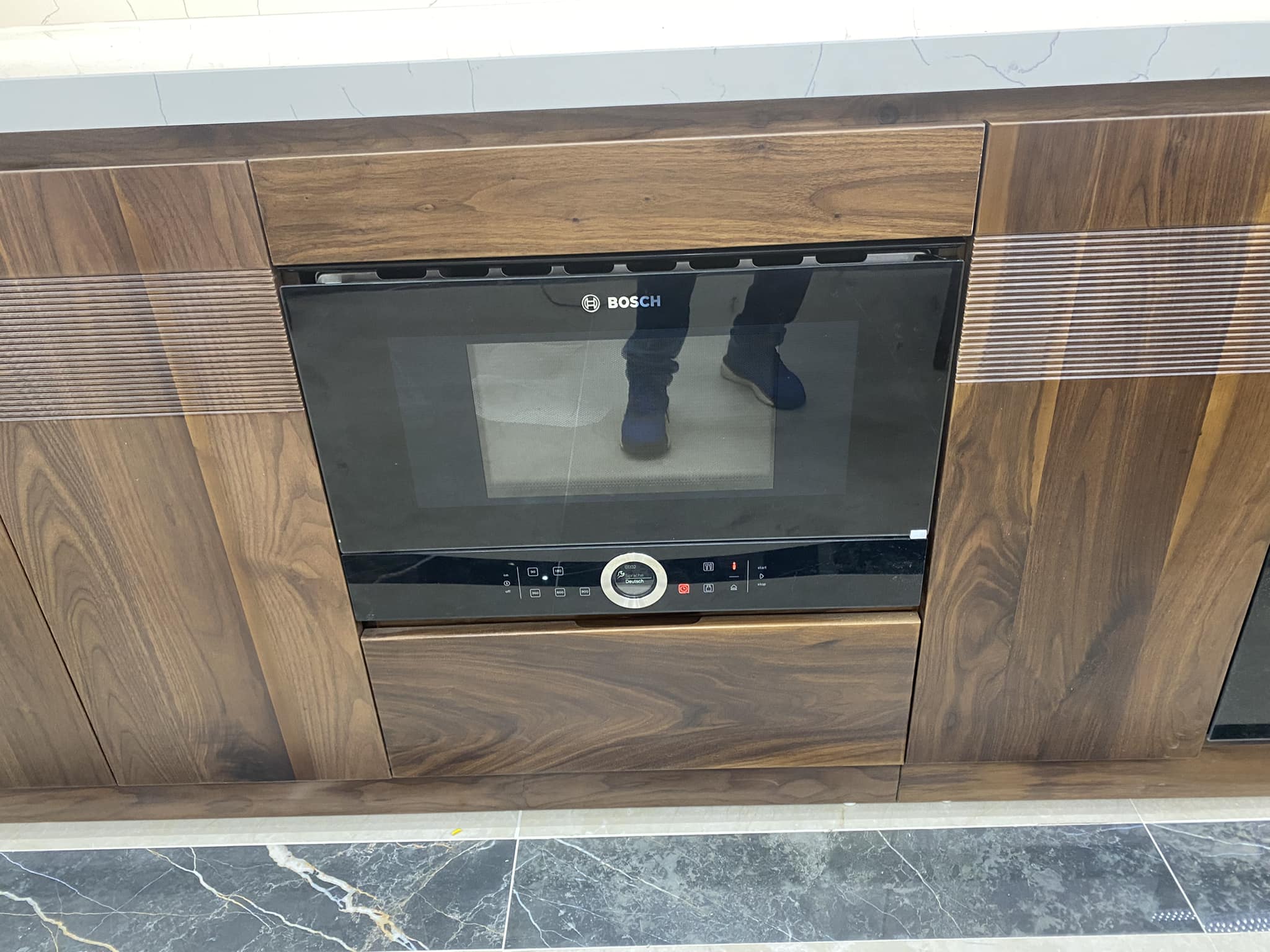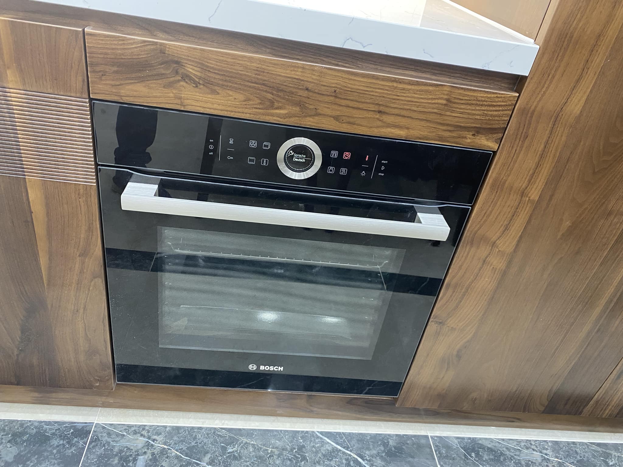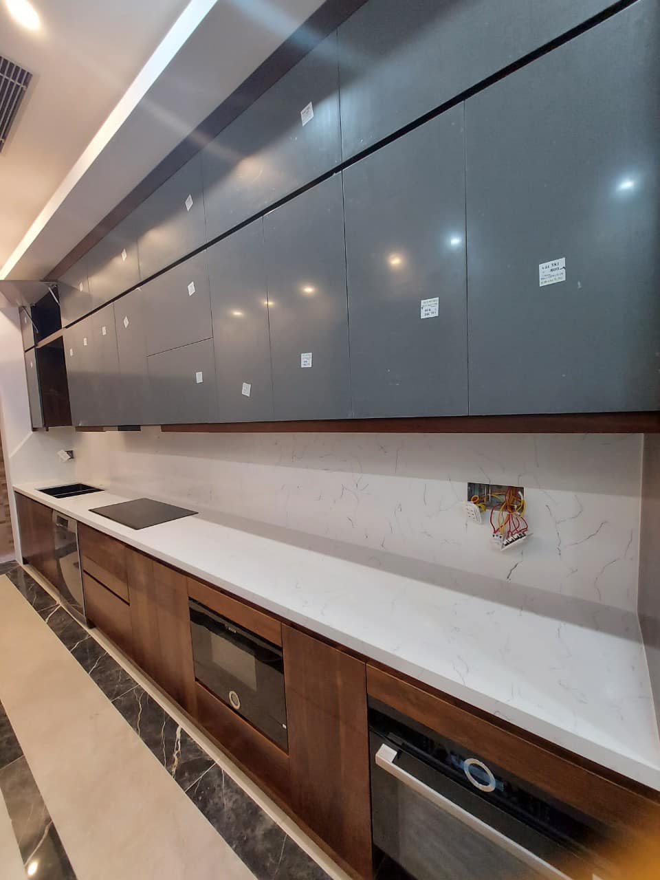 Tủ Bếp Gỗ Óc Chó Kết Hợp Cánh Acrylic – Hiện Đại & Tiện Nghi