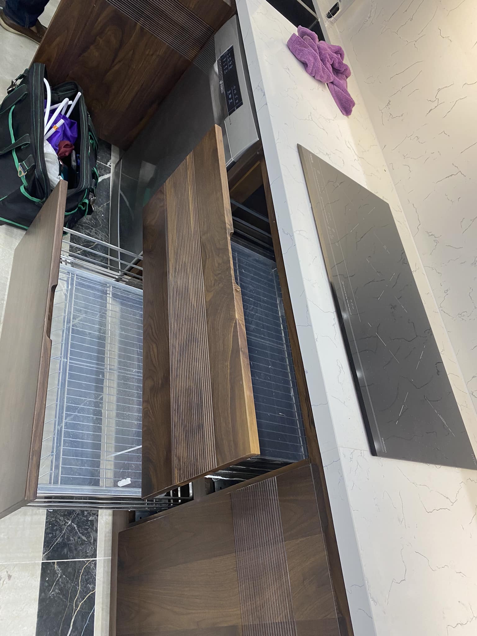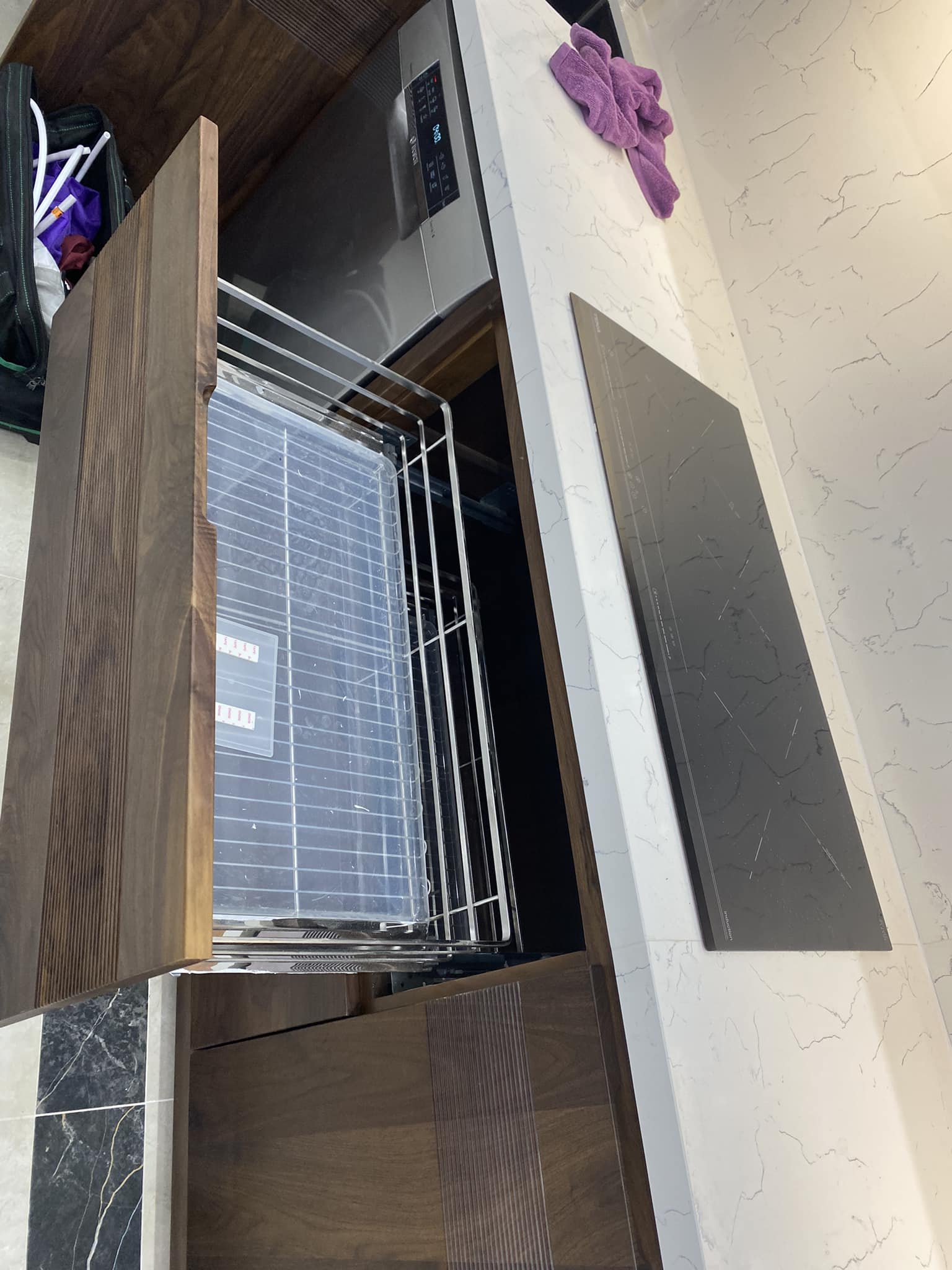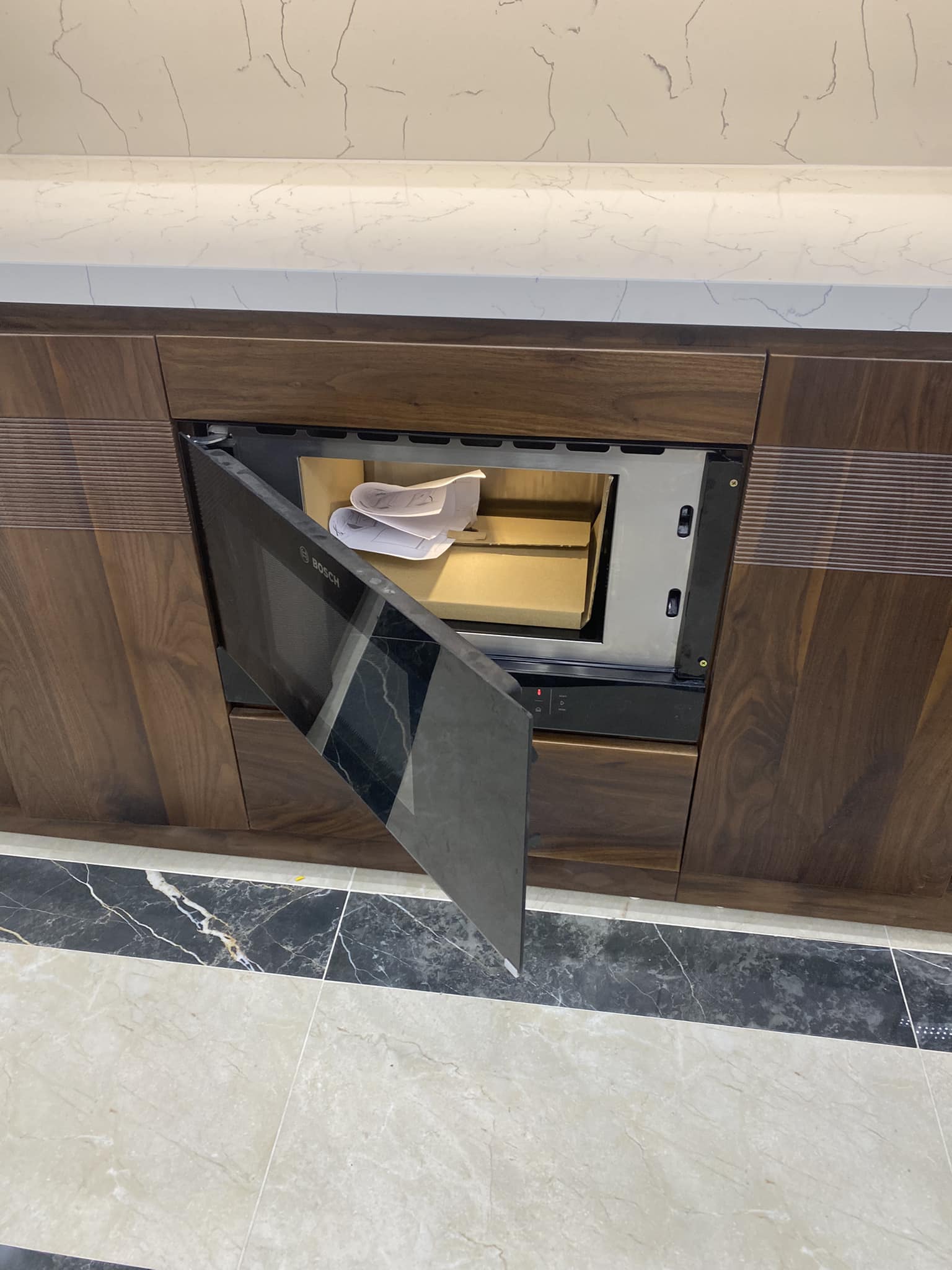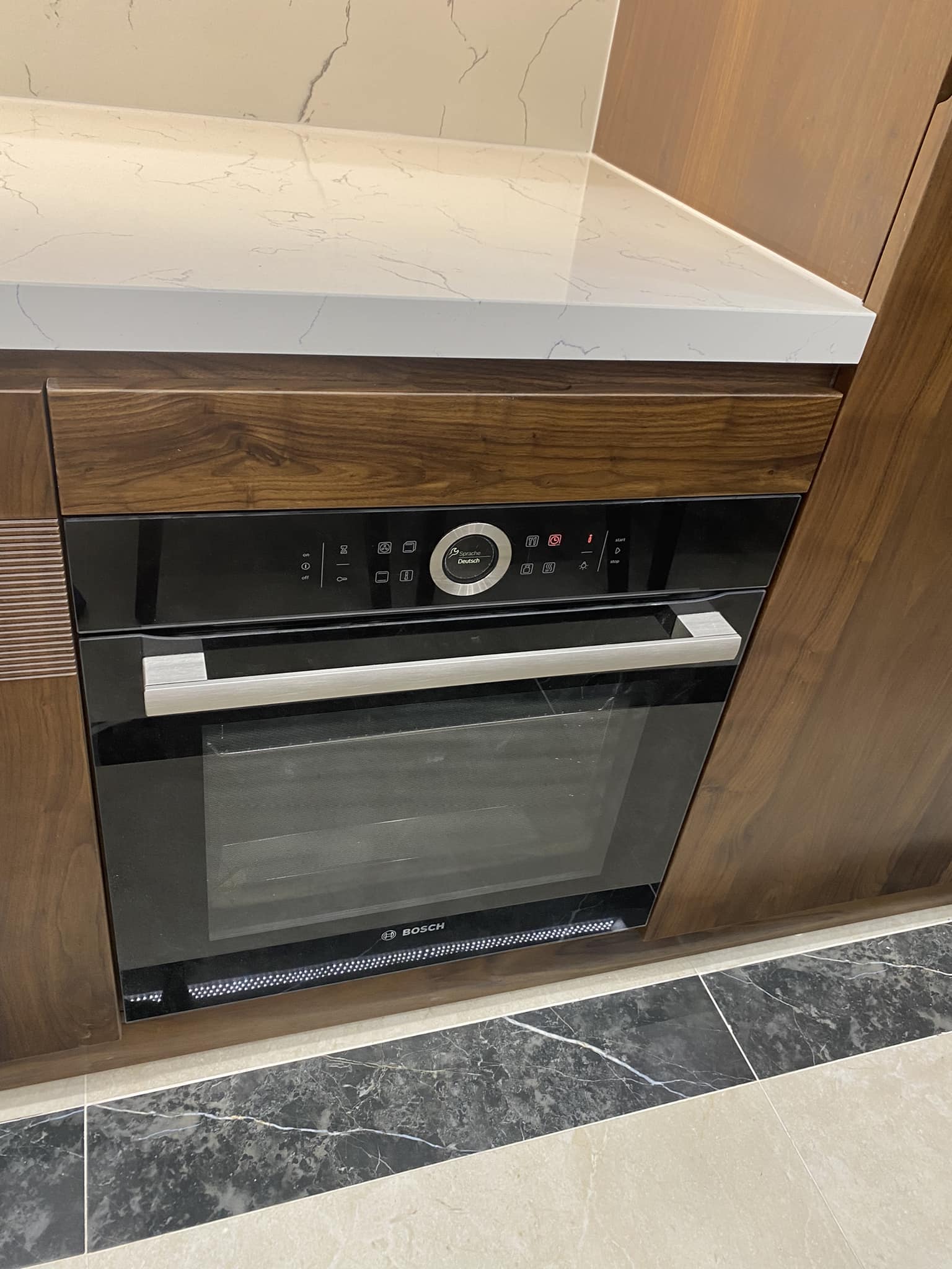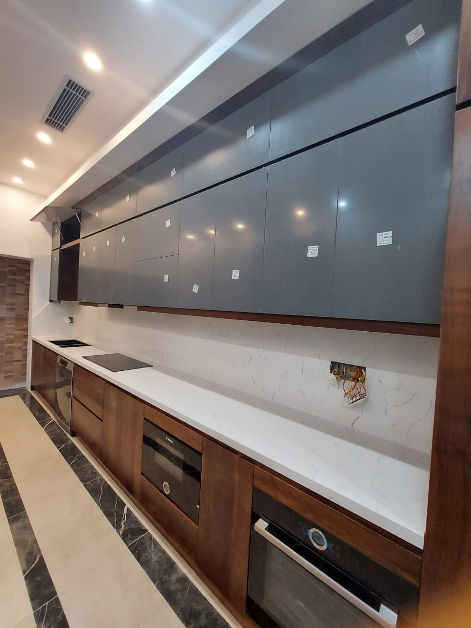 Tủ Bếp Gỗ Óc Chó Kết Hợp Cánh Acrylic – Hiện Đại & Tiện Nghi