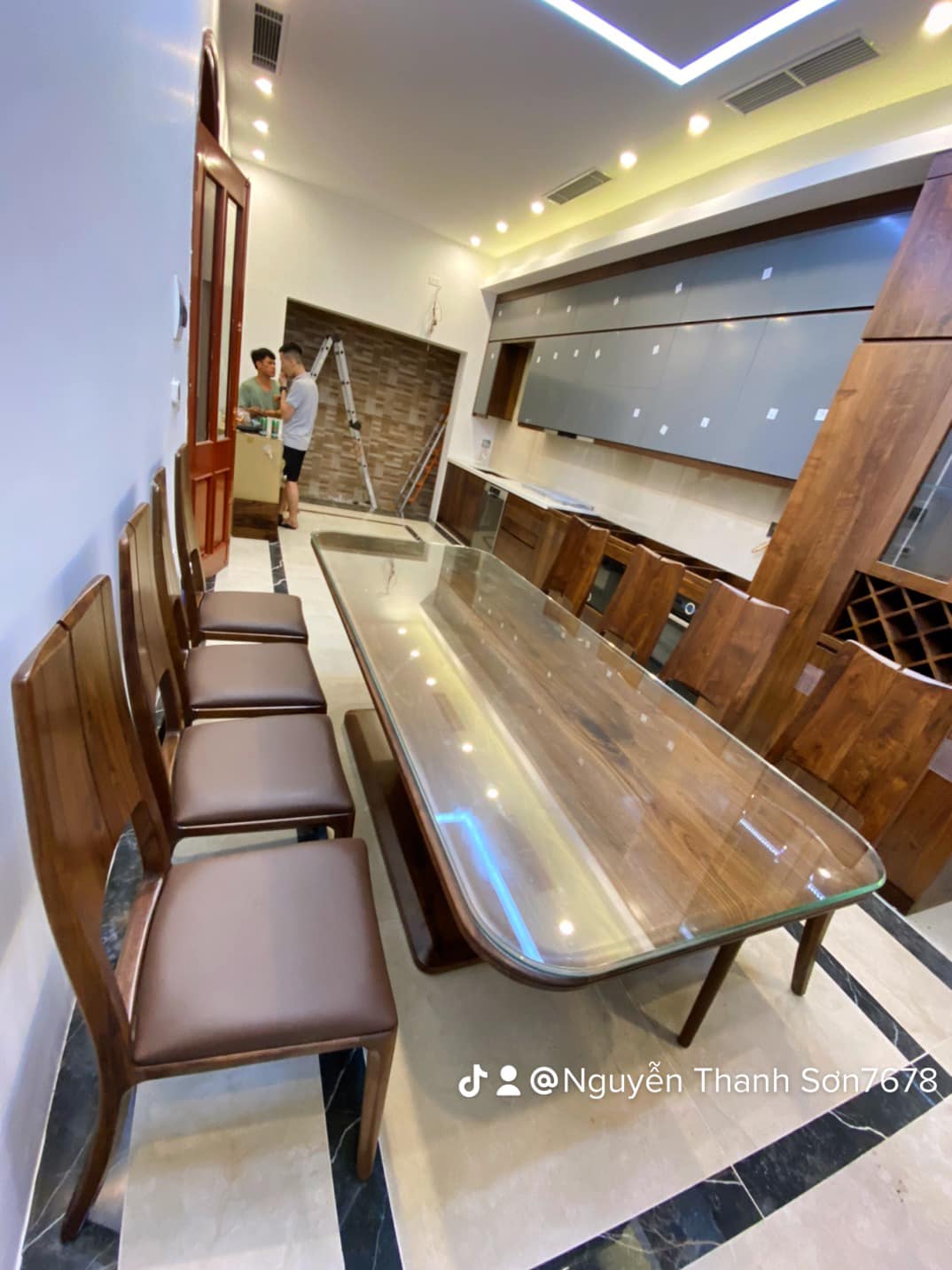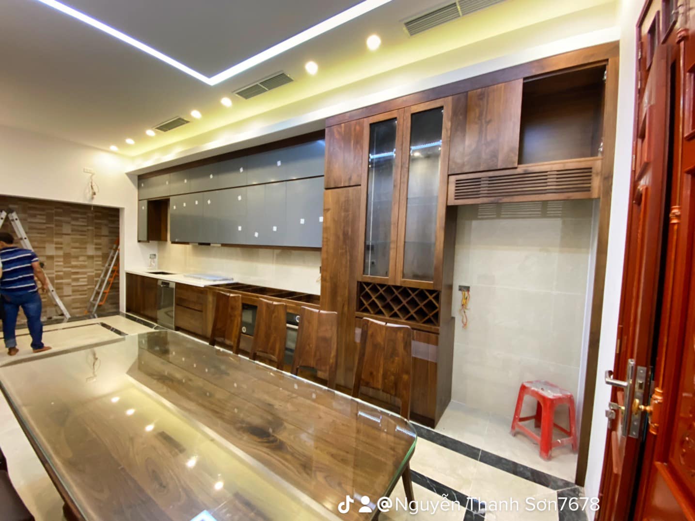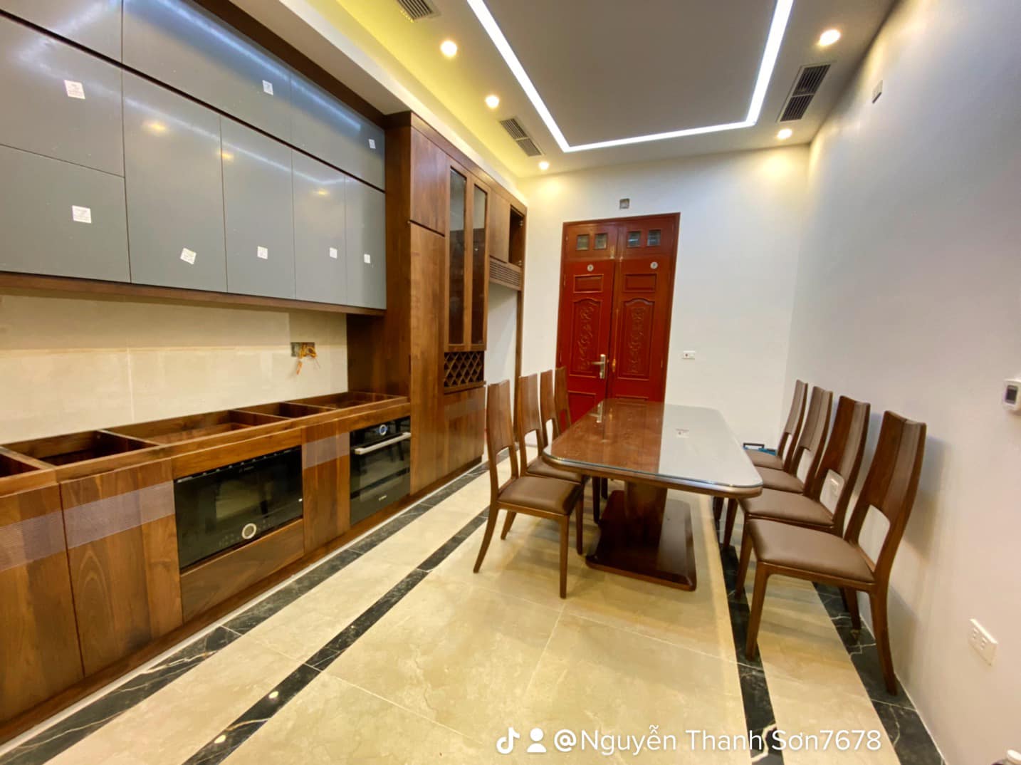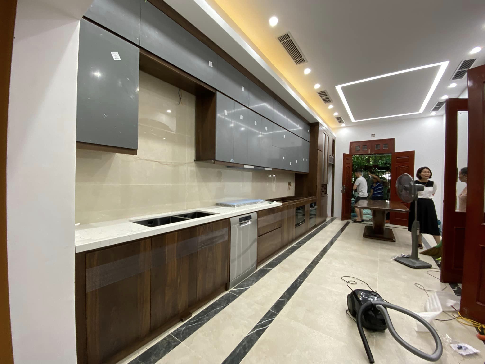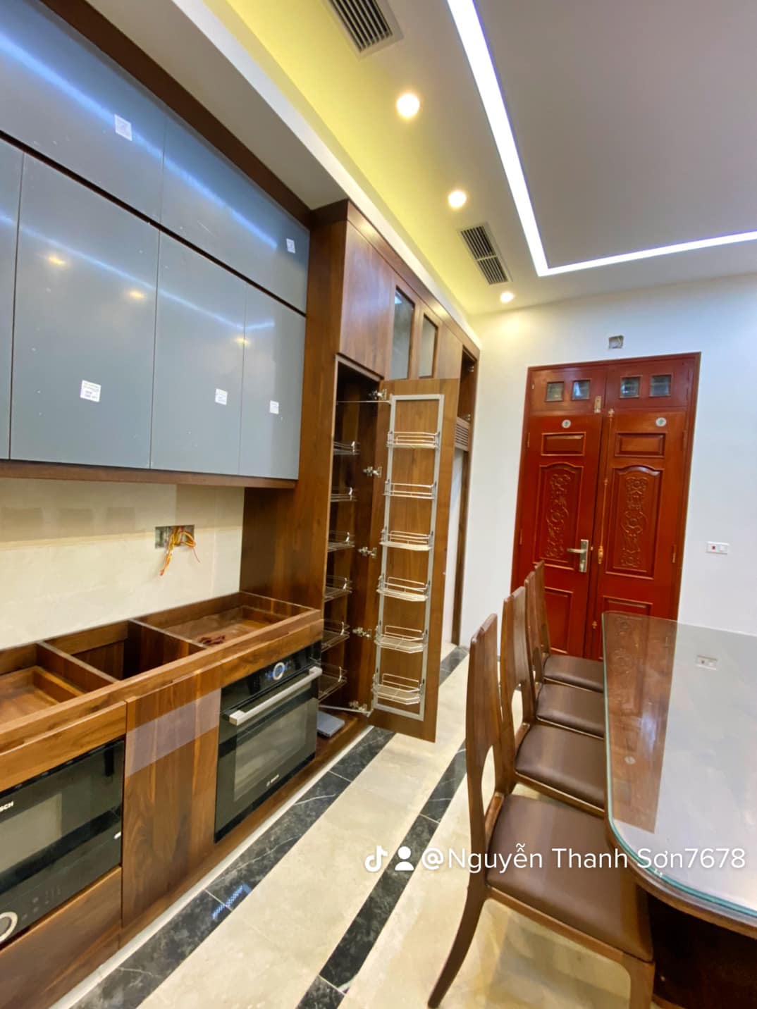 Hệ thống tủ bếp dưới làm từ gỗ óc chó nguyên khối, mang đến sự vững chãi và đẳng cấp. Phần tủ bếp trên sử dụng cánh acrylic bóng mờ, tạo điểm nhấn hiện đại, đồng thời giúp không gian bếp trở nên sáng sủa và rộng rãi hơn. Bố trí thông minh với đầy đủ tiện nghi, từ hệ thống đèn LED chiếu sáng đến các ngăn kéo trượt mượt mà, đảm bảo sự tiện lợi tối đa cho người nội trợ.