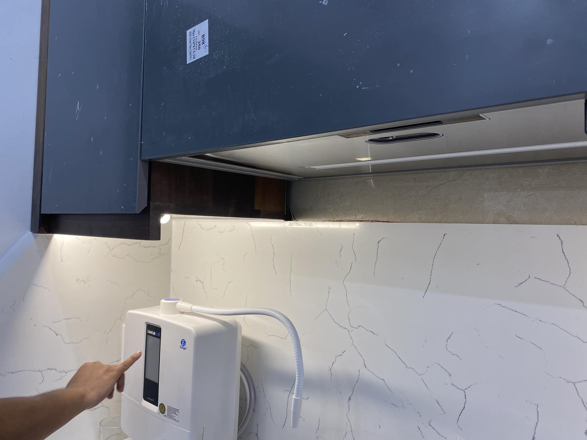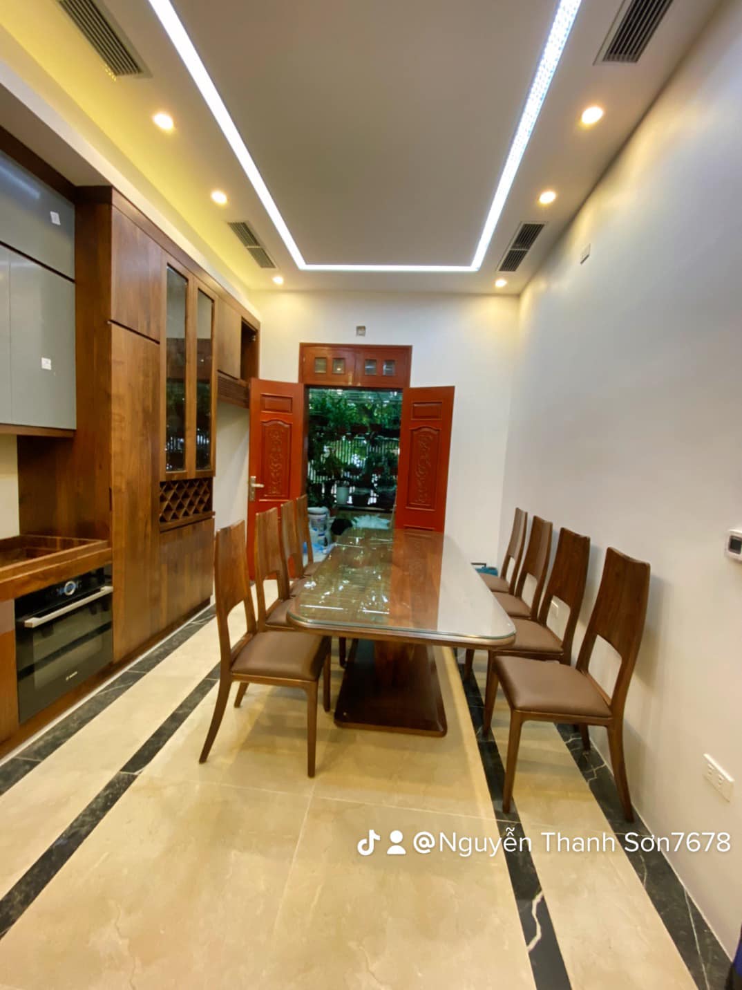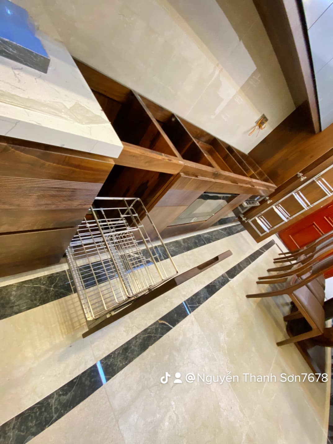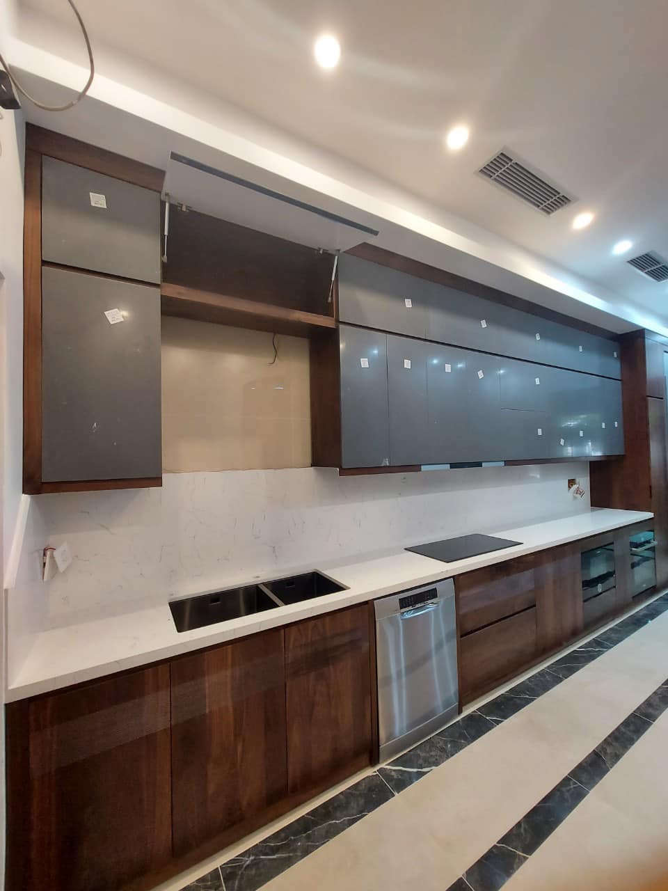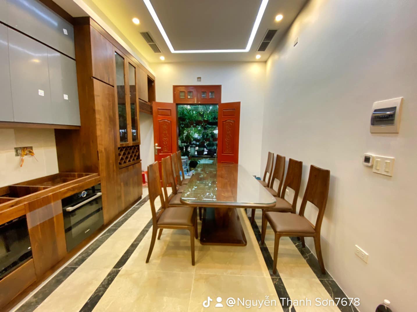 Hệ thống tủ bếp dưới làm từ gỗ óc chó nguyên khối, mang đến sự vững chãi và đẳng cấp. Phần tủ bếp trên sử dụng cánh acrylic bóng mờ, tạo điểm nhấn hiện đại, đồng thời giúp không gian bếp trở nên sáng sủa và rộng rãi hơn. Bố trí thông minh với đầy đủ tiện nghi, từ hệ thống đèn LED chiếu sáng đến các ngăn kéo trượt mượt mà, đảm bảo sự tiện lợi tối đa cho người nội trợ.