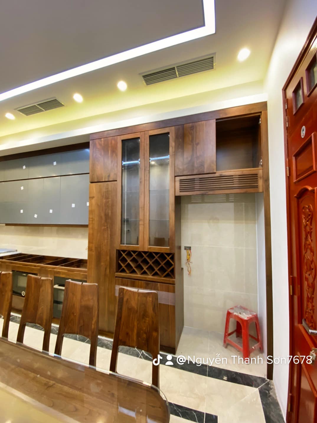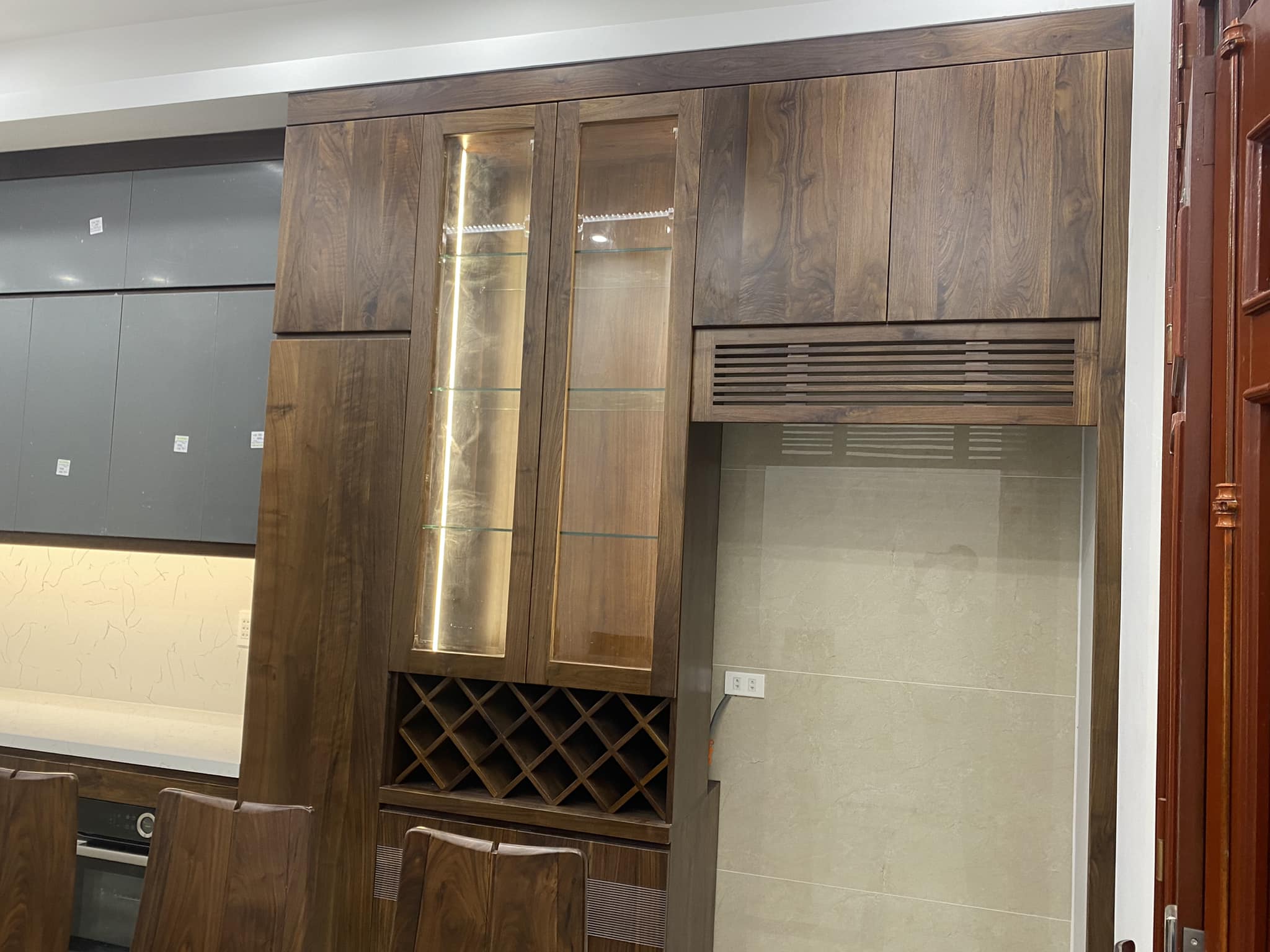 Bên cạnh khu vực bếp là chiếc tủ rượu gỗ óc chó cao cấp, nơi lưu giữ những chai rượu quý cùng bộ ly tinh tế. Thiết kế mở kết hợp kính cường lực trong suốt, vừa bảo quản rượu tốt, vừa trở thành một tác phẩm trang trí đầy nghệ thuật trong không gian.